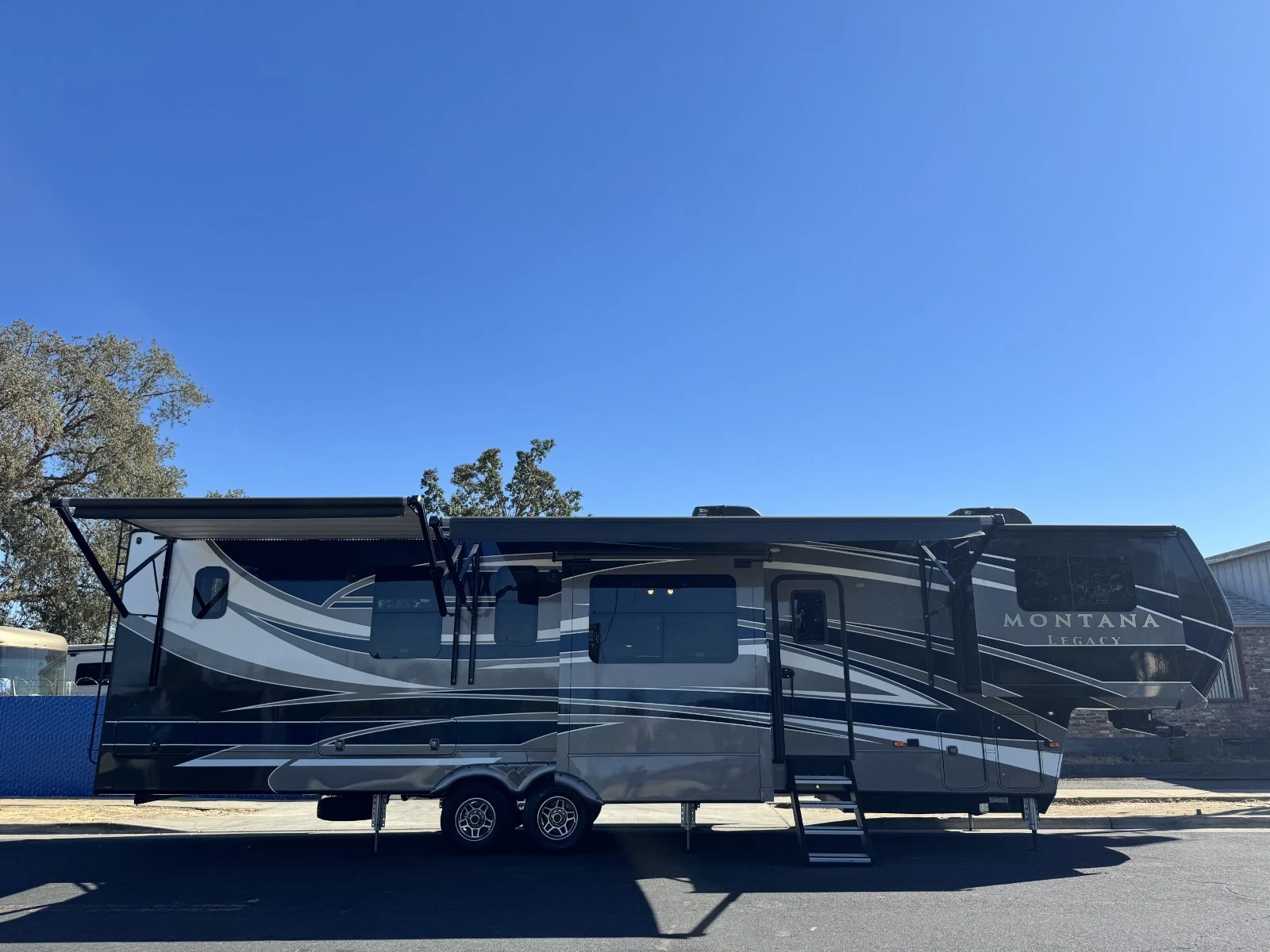 For sale is a 2021 Keystone Montana Legacy 3761FL luxury fifth-wheel trailer. It is approximately 41 feet long, with 5 slide-outs, a GVWR of 16,800, and a dry weight of 14,540 lbs, Fresh water 66gl, Grey 88gl and 88gl black tank. This trailer comes with a 6-point hydraulic leveling system, three air conditioners, two awnings with LED, disk brakes, Sides and rear cameras, Full body paint, washer and dryer prep, night shades, real wood interior, solid counter tops, and much more. Inside features a large bedroom area in the rear with a Queen bed and large bathroom with spacious shower and dual sinks also in the rear. In front is large living area with fireplace, large TV, two sofa beds (one sofa bed missing) and two recliners. Kitchen area in the middle has a large residential refrigerator, a dining table for four (Chairs missing), and large island with sink. Half bathroom is located in the middle just of the kitchen. Trailer also has a new brakes, one new air condition and previous owner installed wall paper in the bedroom on the the TV wall, also half bath walls were painted white. Please see over 200 pictures on our eBay listing.